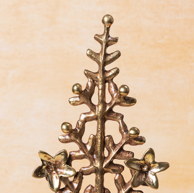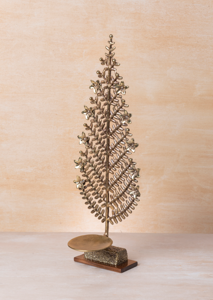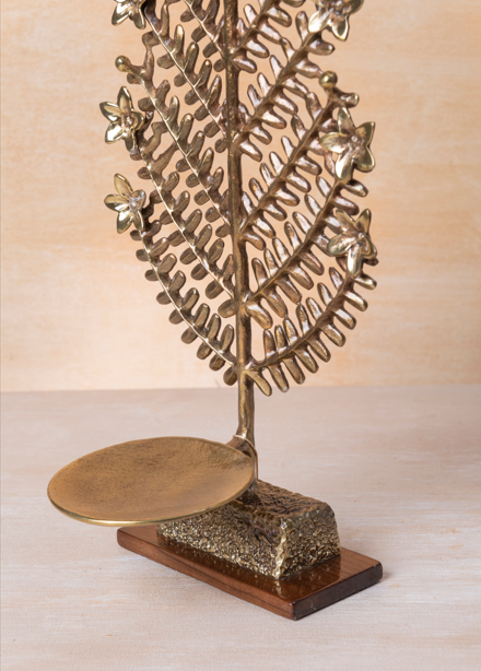 Delicately rendered in layered brass, this piece combines the symbolism of the Tree of Life with integrated candle holders, a play of light and life as it were. The composition casts beautiful shadows when lit merging functionality with craftsmanship.
