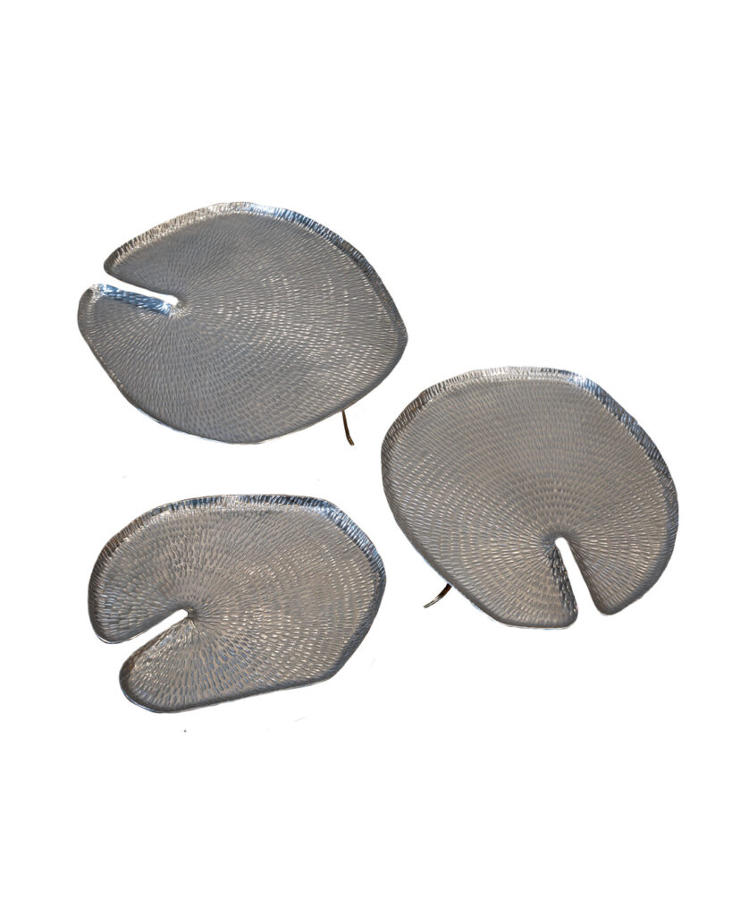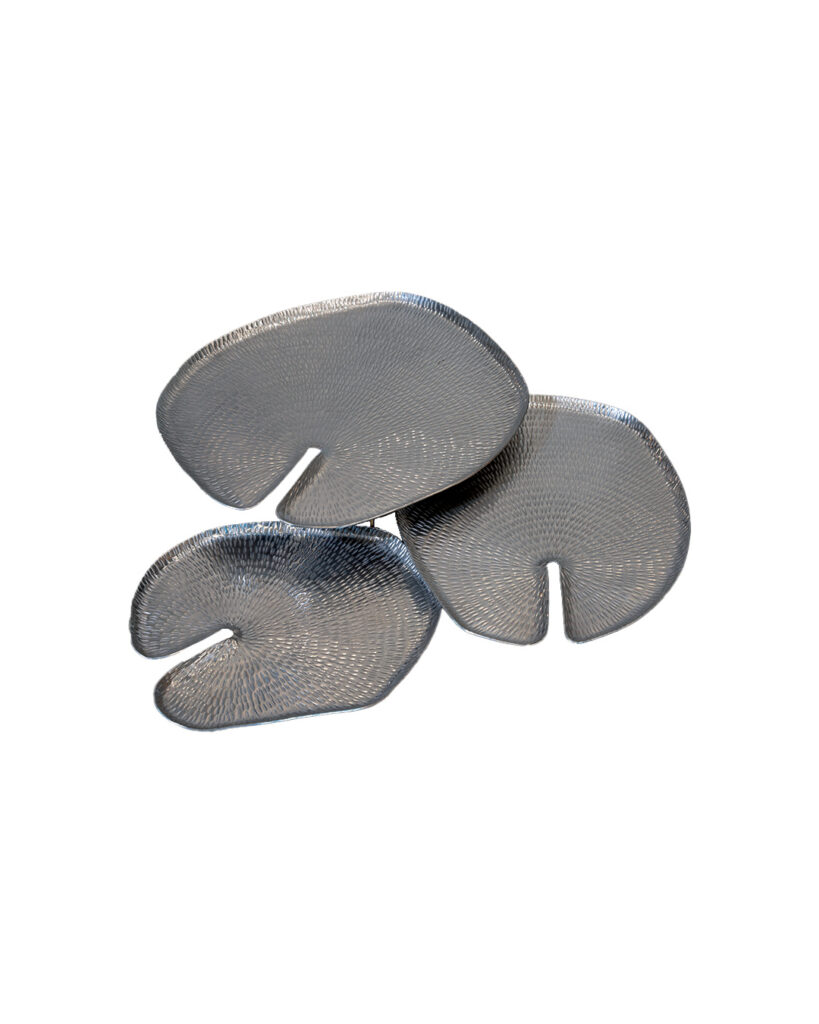 The Thathera artisan’s hand-hammer aluminum/copper into trays of three different sizes in the shape of lotus leaves or ‘Padma.’ Brass legs of different heights allow groupings of these trays to become a table sculpture of the ‘floating world’ with food delicacies featured in each tray.