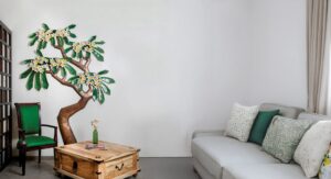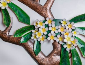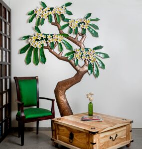 A life-sized mural of the Plumeria tree brings the natural bloom of this flowering plant indoors. The Plumeria or Frangipani is a ritualistic flower in southern Asia, commonly used in worship. The mural is made with completely customizable parts that can be easily dismantled and assembled.