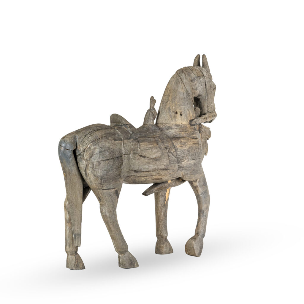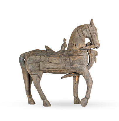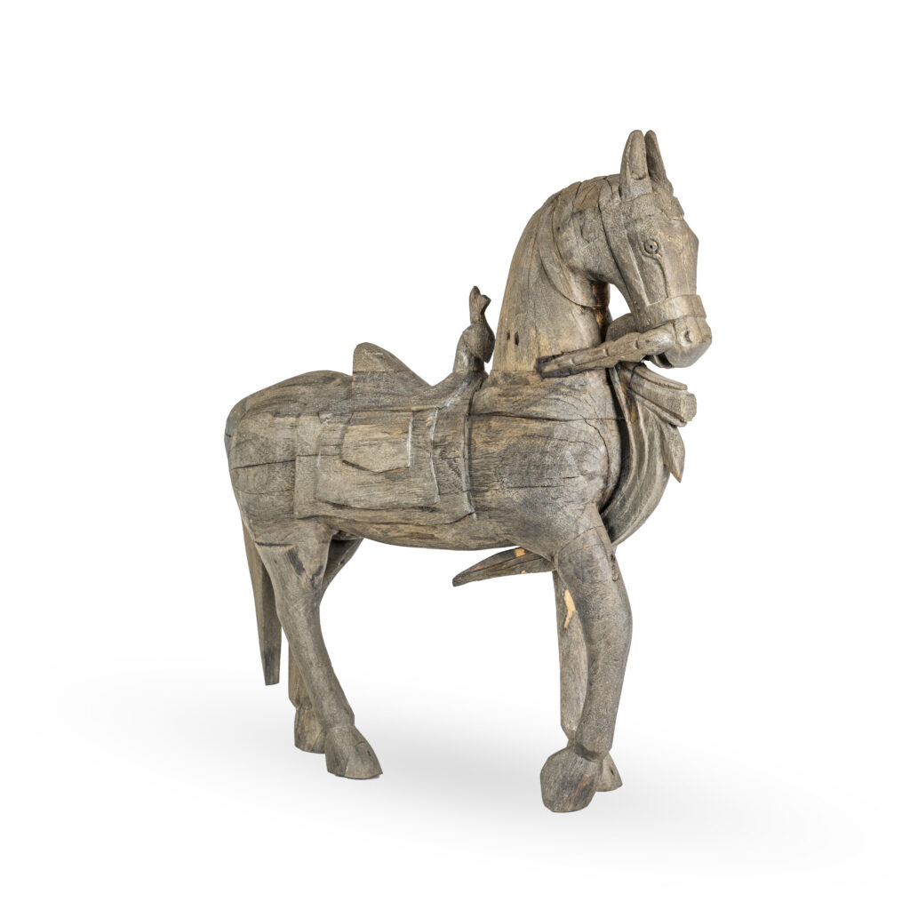 Carved in solid reclaimed wood and treated with a hand-applied distressed finish, this sculptural horse evokes the charm of a bygone era. The surface reveals layers of natural grain and aged pigment, giving the piece an antique character that feels both elegant and lived-in. Mounted on an iron stand, the silhouette is elevated for impact.